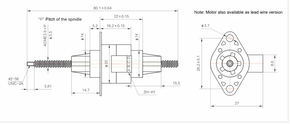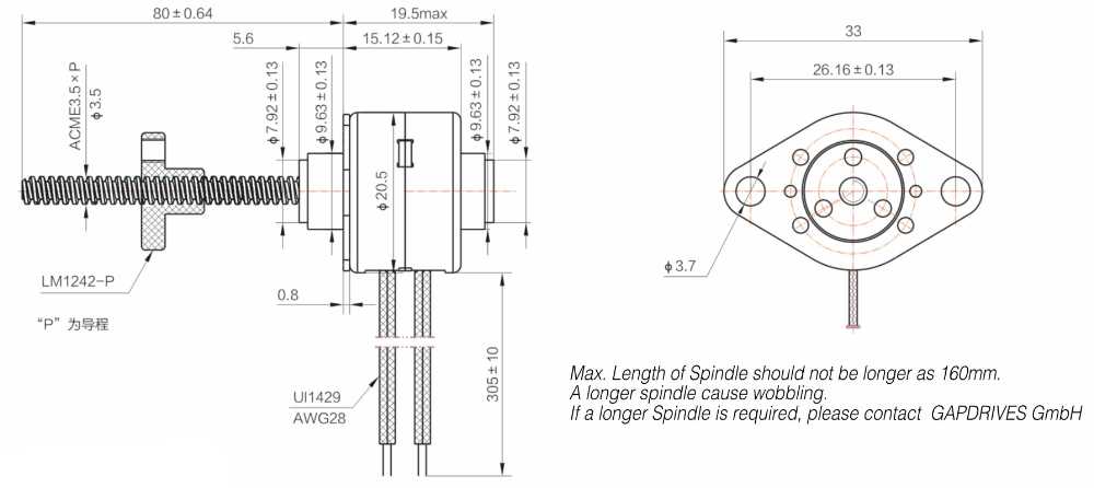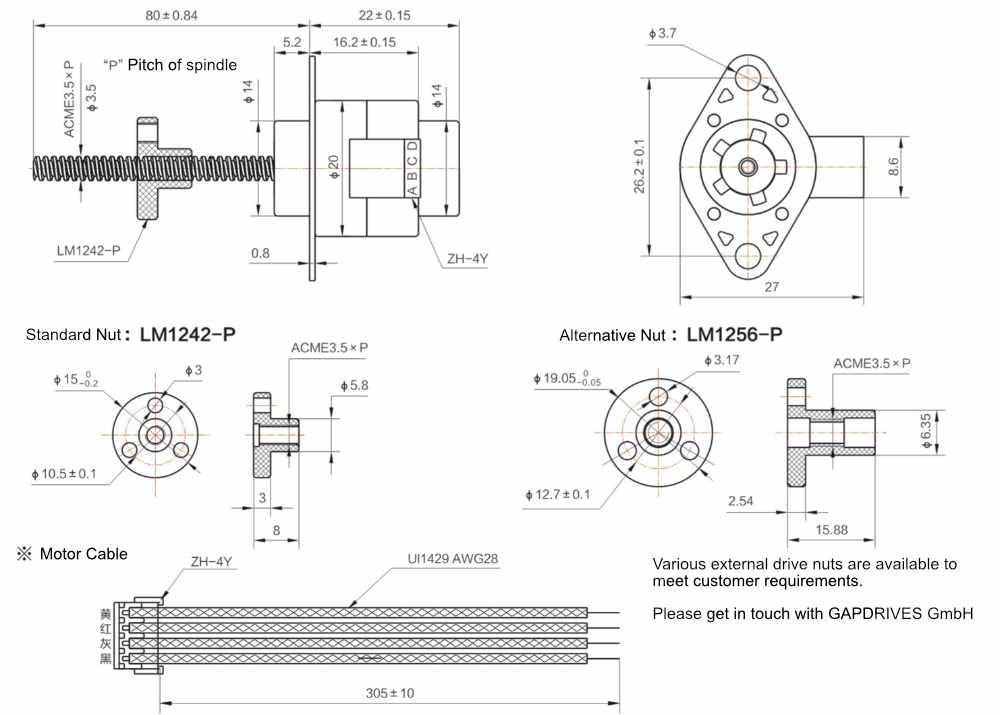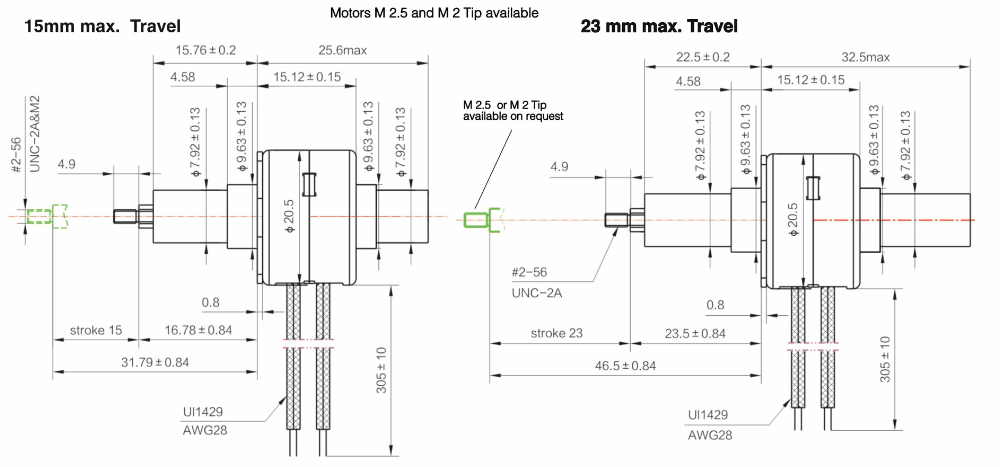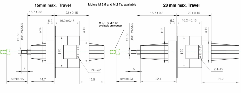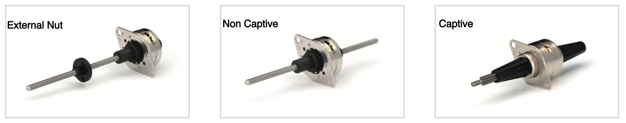 Motor-Type Spindel max 160mm | Motor Typ captive 15mm Hub | Motor Typ captive 23mm Hub | Motor-Typ non-captive | Volt (V) | Strom (mA) | Pitch Spindel (mm) | Auflösung/Step (mm) | Linear Kraft @100pps (N) | Ohm (Ω) |