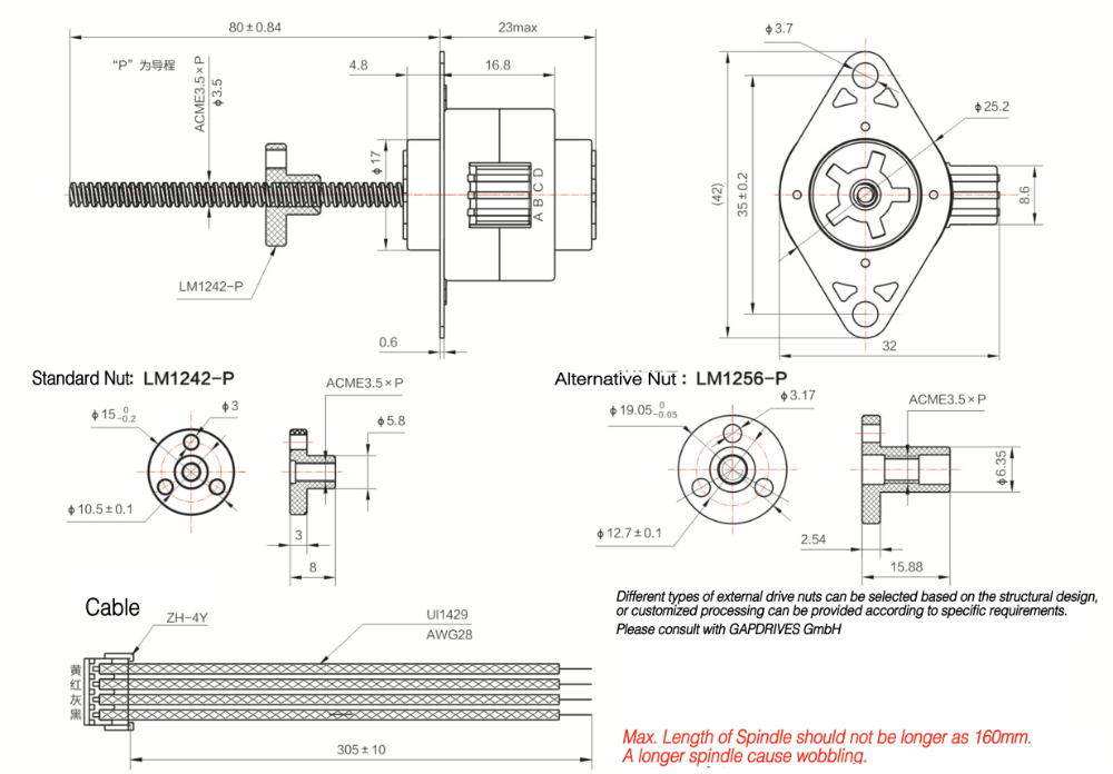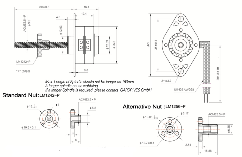 Motor-Type Spindel | Baulänge Motor mm | Spindel Länge mm max. | Schrittwinkel | Strom (mA) | Pitch Spindel (mm) | Auflösung/Step (mm) | Linear Kraft @100pps (N) | Ohm (Ω) | Kabel / Stecker Typ |